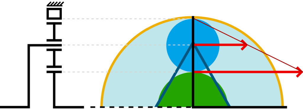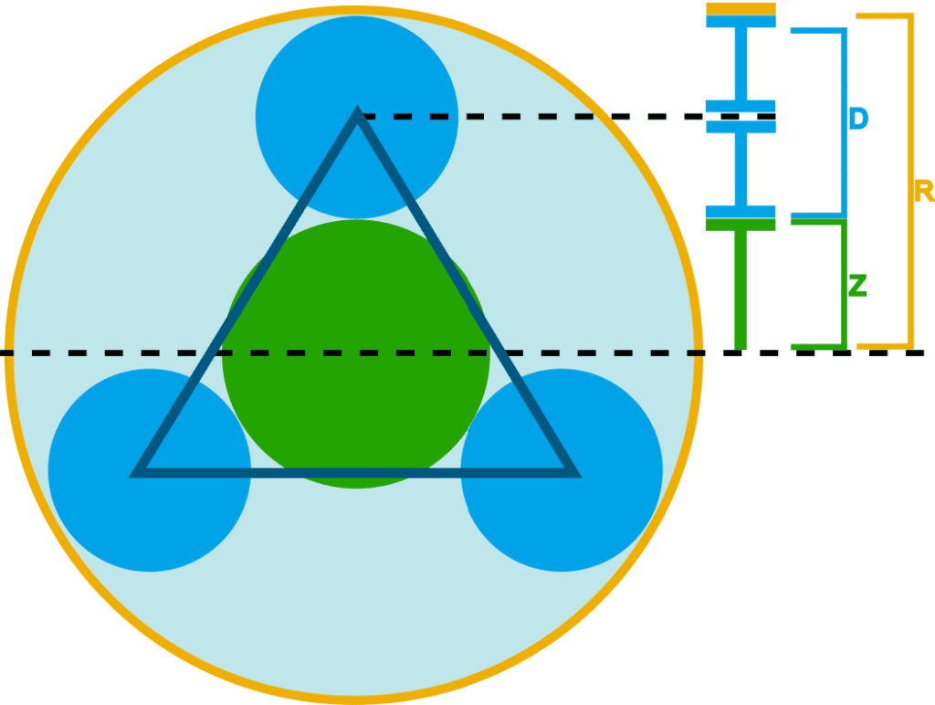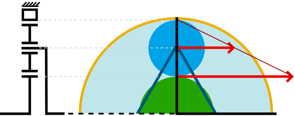 On this page, we look at the ratios that arise from the different number of teeth on the carrier, satellite gears, and ring gear. To get started, we focus on the top part of the planetary gear system (above the dotted line) and the number of teeth are known: