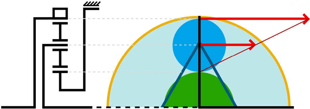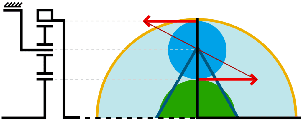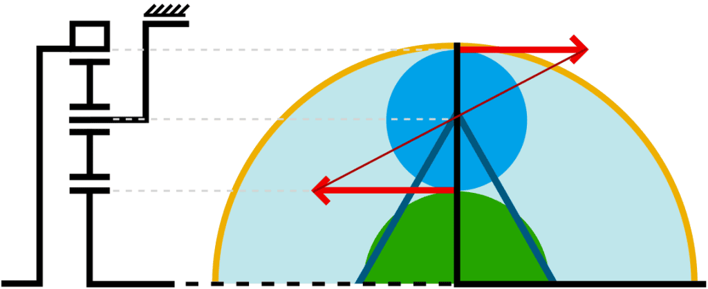 Below, the six transmission possibilities of a single planetary gear system are shown. On the left side of the images, a diagram shows where the incoming energy (e.g., from the engine) enters the system, and departs from the right side of the system. Next to the diagrams, the top views of the system are displayed, where the forces are indicated with red vectors and a connecting line. Where the connecting line touches the Y-axis (midpoint of the sun gear), the system is fixed to the housing.