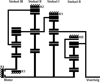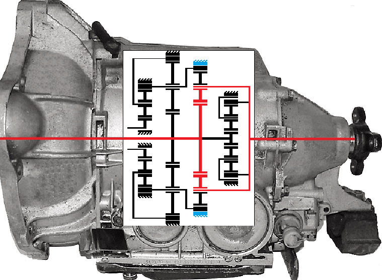 Below is a schematic representation of four sets of planetary gear systems in an automatic transmission. There are three systems for the forward gears and one for reverse. The red line indicates the direction of forces through the automatic transmission; from the left (engine side with torque converter) through the entire section with planetary systems (black lines) to the propshaft coupling. If you closely examine the systems in the transmission, you will see that the above illustration is derived from this. In the transmission, four systems are used, each with an S, C, and R (sun gear, carrier, and ring gear).