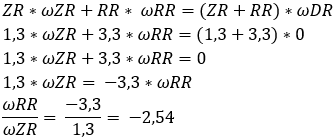 When calculating the ratios, just like in first gear, there is no need to account for other systems: the reverse gear is a simple system. Below are the formulas where eventually the omegas of the ring gear and the sun gear are divided by each other. The negative number (-2.54) indicates that reverse gear is engaged.