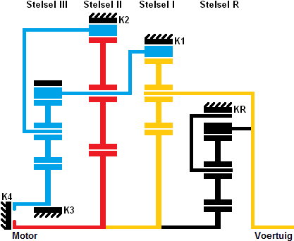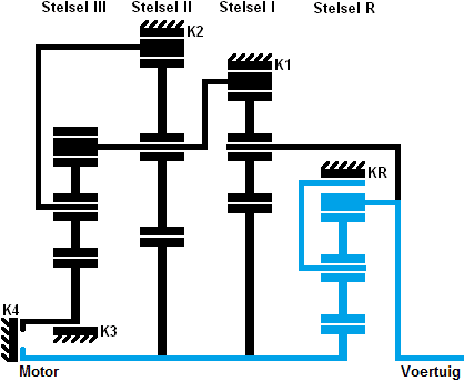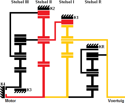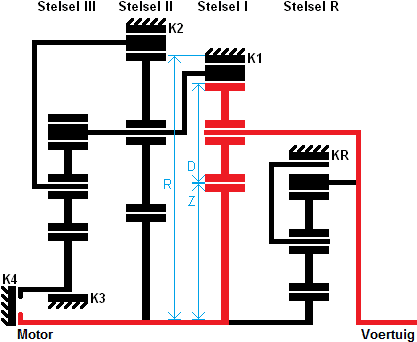 The red lines indicate the force flow. The blue lines indicate what is fixed when clutch K1 is engaged. Not only the carrier of system 1 is fixed, but also the carrier of system 3 and the sun gear of system R are blocked.