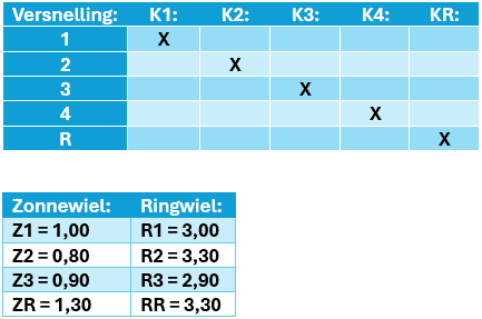 According to the table below, clutch K1 is closed. The ring gear is thus locked. The driving force from the engine goes through the sun gear and via the carrier to the vehicle. The ratios are also given, namely 1.00 for the sun gear and 3.00 for the ring gear of system 1. We will calculate with these.
