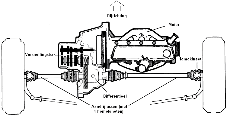 In front-wheel drive, the front wheels are connected to the transmission (with an internal differential) via the drive shafts. The engine is usually transversely mounted to save space. Car manufacturers often choose front-wheel drive. It is cheaper than rear or all-wheel drive because it uses fewer materials, saves space, and is less prone to vibrations compared to rear-wheel drive.