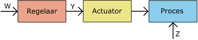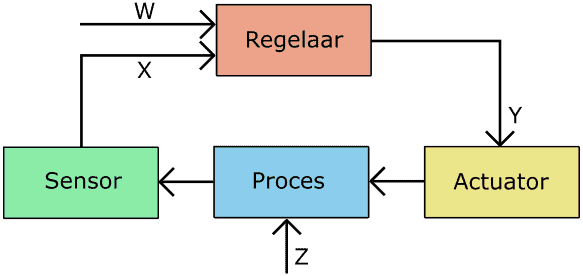 Regulating: the controller can process a manual command (W) or a measured sensor value (X) into actuator control. The actuator causes a change in the process; for example, consider injection duration. More injection means a richer mixture. The oxygen content is measured by the lambda sensor and sends this measured value (X) to the controller. When an unforeseen malfunction (e.g., a blockage in an injector) is present, it causes a change (Z) in the process. This deviation is also measured by the sensor, allowing the controller to adjust the process via the actuator control.