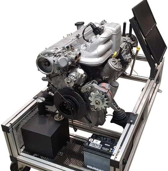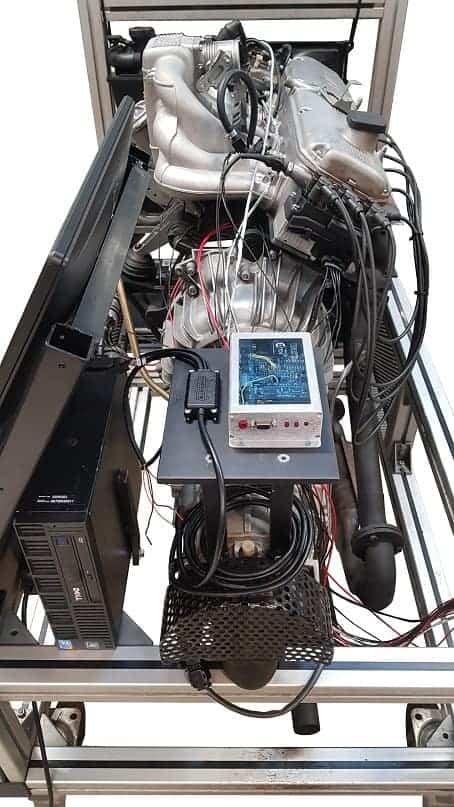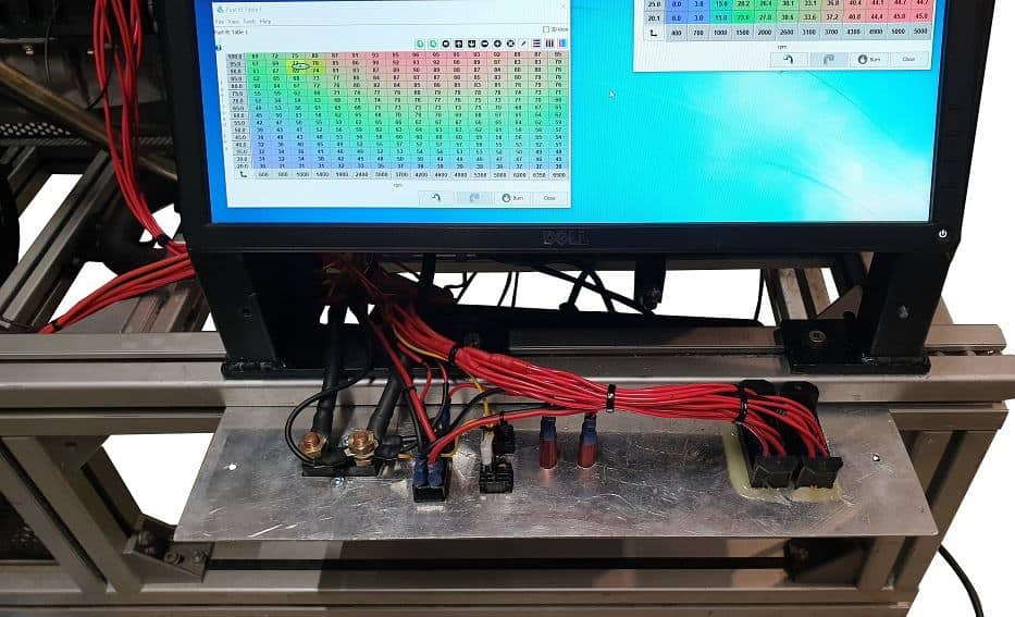 A desktop computer with two displays is mounted on the engine frame. These displays will eventually show the dashboard meters and ignition maps. It is also possible to demonstrate measurements with an oscilloscope (Picoscope) on a screen.