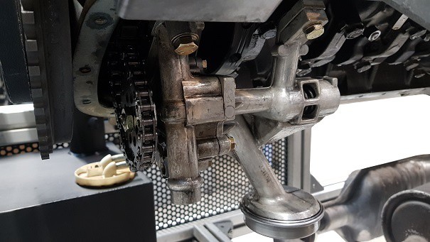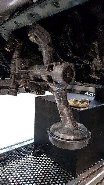 While cranking the engine, attention was paid to the oil circulation in the cylinder head. During starting, there was no oil supply visible to the camshaft etc. It was unclear whether the oil pump and pick-up screen were functioning correctly; after all, the engine had been used for practical assignments in the past. Something might have been lacking in the oil supply. Therefore, it was decided to remove the oil pan and inspect the oil pump and screen.