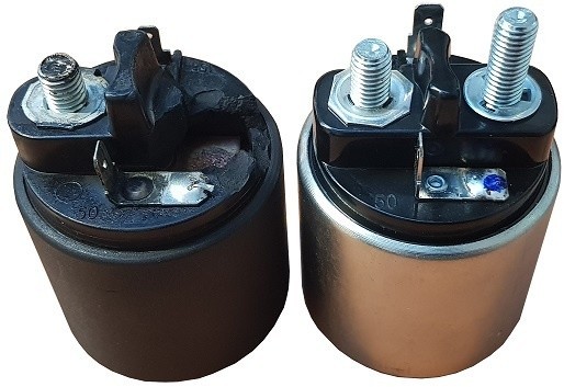 One of the visible defects was a faulty starter relay. At least, the stud terminal was broken. Repairing the starter relay seemed impossible. Fortunately, the costs were manageable: for 9,- the local revision specialist provided a new starter relay. The image shows the defective one (left) and the new one (right).