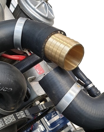 The image below shows the brass hose connector halfway inserted into one coolant hose. The other coolant hose is also mounted on the connector, and the hose clamps are tightened firmly.