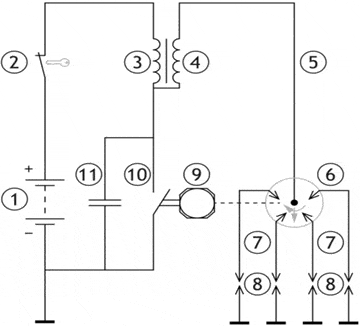 With closed contact points, the primary current begins to build. The current is limited to 3 to 4 Amps by the primary coil’s resistance. When a current flows through the coil’s primary coil, a magnetic field is built. Both the primary (3) and secondary coil (4) are in this magnetic field. When the current through the contact points (10) is interrupted by the breaker cam (9) on the distributor shaft, voltage is induced in both coils. About 250 volts arise in the primary coil. The difference in turns will induce a voltage of 10 to 15 kV in the secondary coil. A spark plug spark occurs when the points open.