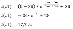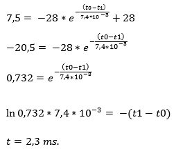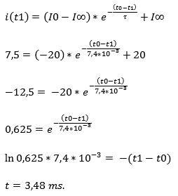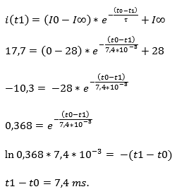 The coil according to formula 14 is charged to 17.7 A at t = 7.4 ms. Actual charging time is shorter since the coil maxes at 7.5 A. Required time can be calculated using known data in formula 15.