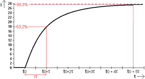 The image shows the charging curve of the primary coil. From time T0 to 1 Tau, the coil is 63.2% charged. This is a fixed percentage for coil charging time. Formula 13 shows the coil is charged to 17.7 Amps at 1 Tau. At t = 5 Tau, the end value is practically reached.