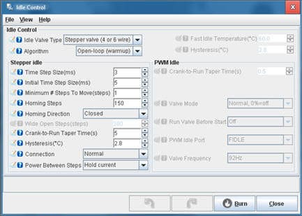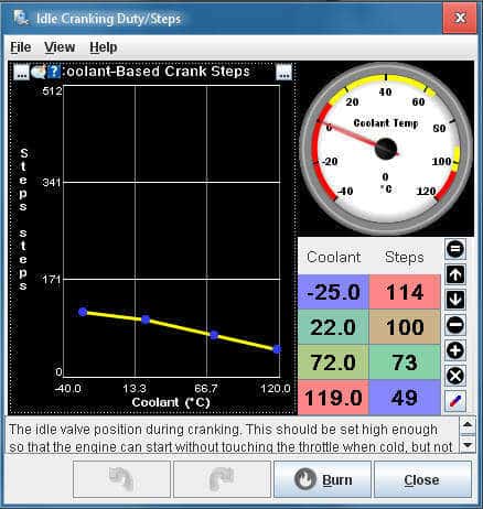 It is also possible to set the stepper motor position during engine starting based on the coolant temperature. This is called “Idle Cranking Duty/Steps.” The image below shows the settings screen.