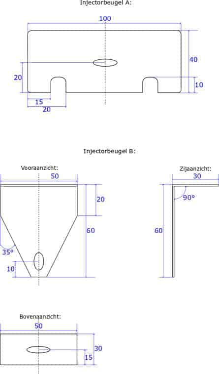 In existing passenger vehicles, injector rails are usually clamped to the intake manifold using clamps or eyelets. The injector rail then clamps the injectors into the manifold. For this project, a flexible fuel hose was chosen for the injector rail, making the earlier mentioned method impossible. Therefore, the injectors are clamped into the intake manifold using a custom bracket. The brackets consist of two parts: an upper part (bracket A) and a lower part (bracket B).