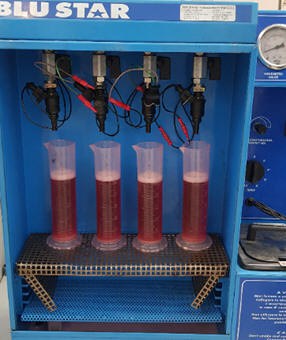 Each type of injector has a different flow rate; the output after a minute of injecting varies by type. Before testing the injectors, they underwent cleaning in an ultrasonic bath. This cleaning method uses ultrasonic waves and a special test fluid to clean the injector inside and out, ensuring any old residues do not affect the flow measurement or spray pattern. During ultrasonic cleaning, the injectors were continuously opened and closed, and the spray pattern of each injector was observed as a fine mist. No abnormalities such as droplet formation or an irregular stream were seen upon closure. After ultrasonic cleaning and testing, the O-rings were replaced to ensure a good seal when mounted in the intake manifold.
