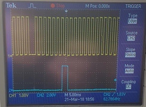 The image shows the dual-channel oscilloscope display, with the top trace showing the crankshaft reference point and the bottom trace showing the control signal from the MegaSquirt to the DIS coil. The control signal has a voltage of 5 volts (a logical 1) and lasts about 1.5 ms.