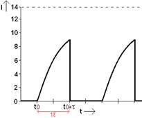 According to coil specifications, the primary current after charging amounts to 7.5 A. The current doesn’t rise higher. Time to reach 7.5 A is called dwell time, depending on battery voltage, here 14 volts. Without regulating, the coil current would, according to formula 12, max out at 28 Amps.