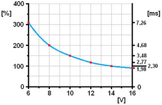 When battery voltage drops, for example, during engine starting, it affects dwell time. It takes longer than 2.3 ms to reach 7.5 A. The previously known formula determines new charge time. Maximum current is determined by battery voltage: