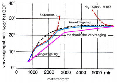 The conversion of engine vibrations to a knock signal is done by an interface circuit. This circuit is not present in the MegaSquirt II. Therefore, the choice was made to safely set the full-load and part-load advance, ensuring the engine does not enter the knocking range. The full-load advance curve must be established within the knock boundaries. Centrifugal and vacuum advance data from the conventional ignition is determined based on factory data from the engine manual. Points can be plotted on a graph (example in the image below).