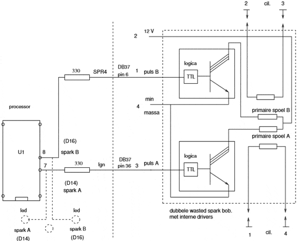 When cylinder 1 undergoes a compression stroke and cylinder 4 an exhaust stroke, the MegaSquirt controls the primary coil A via pin 36 on DB37 (see image below). This control is based on the crankshaft reference point (between 90 and 120 degrees before TDC). The MegaSquirt controls primary coil B, responsible for spark formation in cylinders 2 and 3, 180 degrees after coil A. No reference point is present for coil B, but ignition timing can be simply determined by counting teeth on the 36-1 trigger wheel.