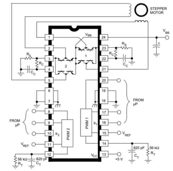 Between coil A and pin 7 of the processor is a 330-ohm resistor depicted. This resistor limits the drive pulse’s current and induced voltage. As this resistor is not standard on the MegaSquirt circuit board, it must be mounted afterward. Components left of the vertical dashed line in the image below show the internal circuit of the MegaSquirt. The components shown (two 330 ohm resistors and LEDs) were to be soldered onto the circuit board afterward.