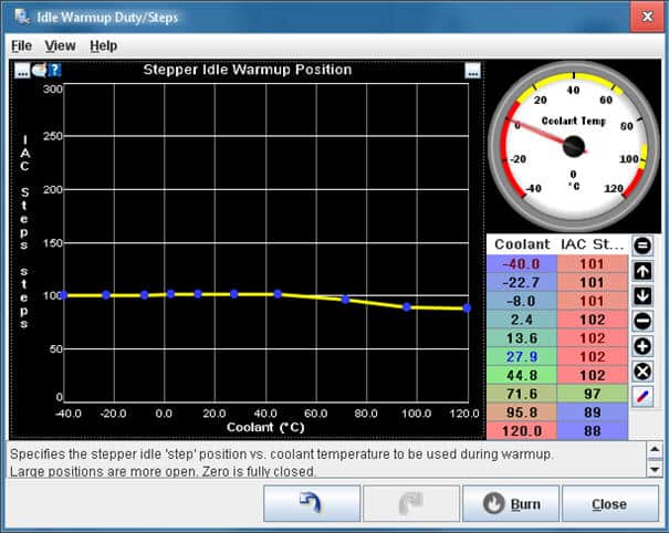 The stepper motor’s position depends on the coolant temperature. When starting a cold engine, the valve should be more open than with a warmed-up engine. The image below shows the settings screen to configure steps in relation to coolant temperature. When the engine is cold, the stepper motor remains fully open during idle. The stepper motor slightly closes during the warm-up phase.