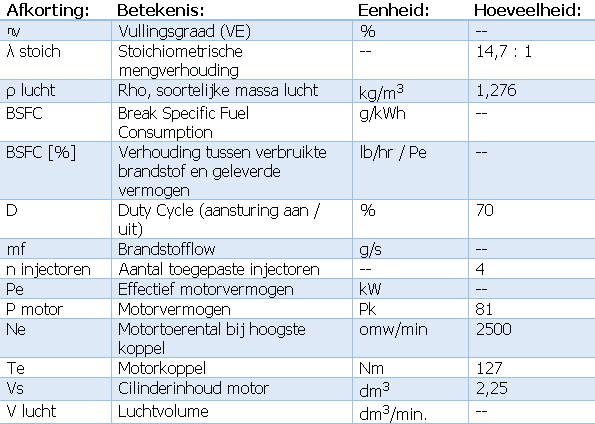 The calculation result indicates which injector is suitable for this engine configuration. A deviation of less than 20 ml from the calculated value is not problematic. This difference is compensated by adjusting the MegaSquirt software. The following table provides an overview of the data used in the formulas: