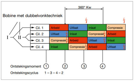 The image shows the working diagram of a four-cylinder petrol engine with a DIS coil. This diagram shows two ignition markings per ignition moment; one generates the spark to ignite the mixture, the other is the wasted spark. A DIS coil can be controlled with just two pulses by the MegaSquirt.