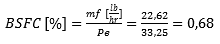 The actual BSFC is multiplied by 3600 in formula 6 to convert to kWh. The BSFC of a gasoline engine usually ranges between 250 and 345 g/kWh. The lower the value, the more efficient the engine is. Formula 8 indicates the ratio between fuel flow in pounds per hour and effective engine power. This percentage is used in formula 9.