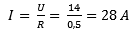The maximum current, according to Ohm’s Law, would be 28 Amps:
