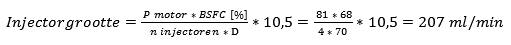 The flow rate is crucial in determining the correct injection amount, and thus the control. Choosing injectors that are too large will result in a very short injection time at idle speed, potentially causing irregular engine running. The injection quantity must be enough to inject all fuel in the available time. The injection amount is indicated as injection time in milliseconds, based on high load and high engine speed at a MAP of 100 kPa. Based on engine properties, the required injector flow can be calculated, indicating how many milliliters of fuel are injected per minute.