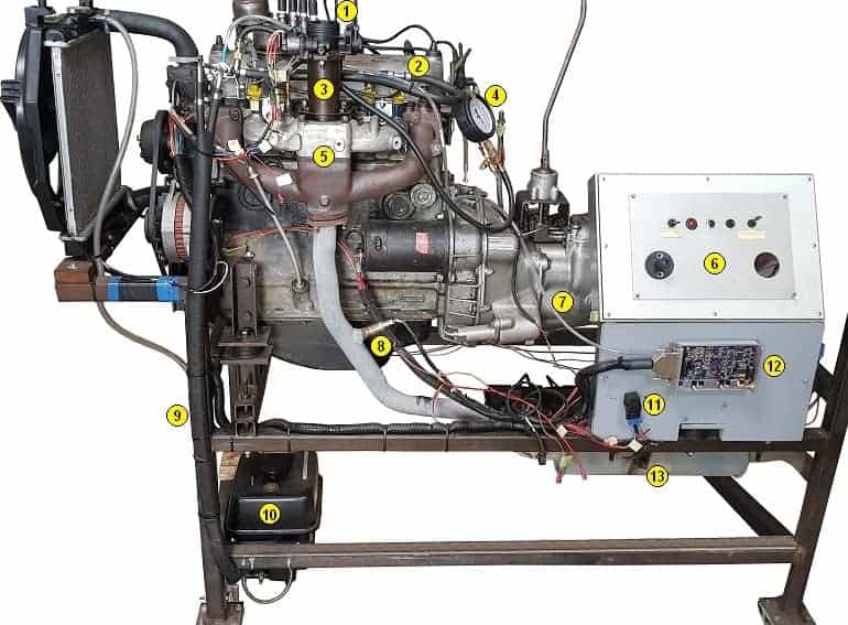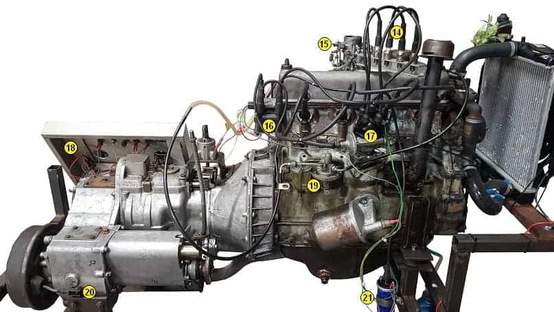 This photo shows the other side of the engine. The carburetor (15) and conventional ignition (17) are visible. This classic ignition aims to spark test setup plugs (14). It’s functionless for the engine, but provides insight into how ignition worked in classic cars.