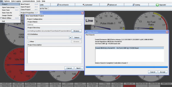 The MegaSquirt II ECU is connected to a desktop PC or laptop via the software program “TunerStudio”. Through this program, settings in the MegaSquirt can be loaded. The image below shows the screen where the MegaSquirt is connected to the PC via a COM port.