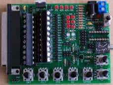 The image shows the assembled JimStim simulator where no controllers and jumpers have been applied yet. On the left side is the connector where a flat cable allows the connection between the MegaSquirt and the simulator. Once the assembly process is completed, the simulator is replaced by the connector on the engine to which all sensors and actuators are connected.