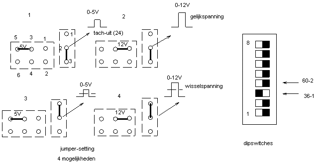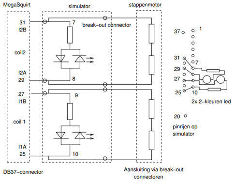 The simulator has a number of dip switches that properly set the crank signal. Appendix 17 provides a schematic overview. It is possible to choose between a 36-1 or a 60-2 crank reference wheel, between a 5-volt or 12-volt signal, and whether the crank position sensor provides an AC or DC signal. Naturally, the settings chosen correspond to the components applied on the engine. The simulator is equipped with several LEDs. These LEDs light up or blink when controlling the following electrical components: