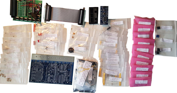 The image shows an overview of the supplied parts. The simulator is visible at the top left, which can be used to create and measure the input and output signals of the MegaSquirt after the assembly process. At the bottom center, the MegaSquirt circuit board is on the left and a bag with large connection components is on the right. The daughterboard, which makes it a MegaSquirt 2 version, is visible at the top center. This daughterboard is inserted into the mounted processor socket afterwards. Between the easily visible parts are fifty bags with loose components. Each bag contains different electrical components such as resistors, transistors, diodes, opamps, voltage regulators, LEDs, an opto-coupler, and several other ICs.