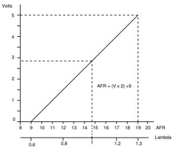 The MegaSquirt does not have an internal lambda controller. When the characteristics of the wideband sensor are known, they can be input into the TunerStudio program in a table. In other cases, a wideband sensor with an external controller is required. The output voltage is linearized by the external controller. The output voltage from the controller to the MegaSquirt ranges from 0 to 5 volts, with a linear relationship between the lambda value and the voltage. The voltage value is converted to a lambda value in the MegaSquirt. The image shows the graph with the linear relationship.