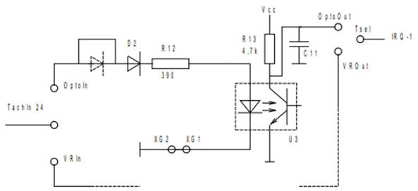 For assembling the Hall sensor circuit in the MegaSquirt, capacitor C11, resistors R12 and R13, diode D2, and opto-coupler U3 need to be installed (see image below). The signal from the Hall sensor enters the schematic in figure 105 at “Opto in.” The signal reaches the so-called opto-coupler via the diode and resistor. This component is indicated with a dashed line. The opto-coupler is a small integrated circuit where the LED on the left side turns on, allowing the phototransistor on the right side to conduct. The opto-coupler can be considered as a switch without mechanical or electrical connections between the control and switching sections.