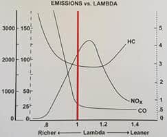 The lambda value not only affects power and fuel consumption but also exhaust emissions. A richer mixture results in lower NOx levels but also higher CO and HC emissions. In a leaner mixture, the fuel particles are further apart, causing combustion to no longer be optimal, resulting in increased HC emissions as well. The image below shows emissions related to the lambda value. When using a catalytic converter, it is desirable for injection to fluctuate between rich and lean. A rich mixture forms CO due to oxygen deficiency, which the catalytic converter uses to reduce NOx. A lean mixture contains excess oxygen, oxidizing CO and HC.