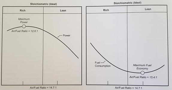Enriching to λ = 0.8 means a mixture ratio of 11.76 kg air to 1 kg gasoline is applicable. There is thus less air available for 1 kg of fuel. The enrichment or leaning of the mixture must always remain within the explosion limits. Enrichment occurs when more power needs to be delivered by the engine. Additionally, a richer mixture provides cooling. A lean mixture, on the other hand, results in more favorable fuel consumption. The image below shows two graphs displaying maximum power and lowest fuel consumption.
