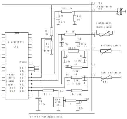 In addition to the sensors, the schematic also contains several resistors and capacitors. The composition of these components forms filters; these filters are used to capture interference and noise. If the sensor signal is distorted by noise, it can have major consequences for the operation of the actuators, and thus also for the functioning of the engine.