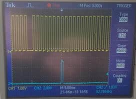 The oscilloscope image (see figure) shows the crank signal (top) relative to the coil’s drive signal (bottom). At the eighth tooth after the missing one, the drive pulse to the coil is formed. During idle, the ignition is advanced by 10 degrees, which corresponds to 1 tooth. This matches the 90 degrees (9 teeth) between the removed tooth and the actual top dead center.