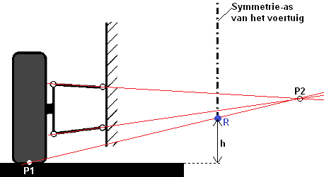 The roll center of a vehicle is determined from points P1 and P2 (see image on the right), which are calculated by (imaginarily) extending the springs/control arms (see images). By extending both control arms, point P2 is found (where the lines intersect). Then the line can be drawn from point P1 (the center of the tire-road contact) to the previously found point P2. The roll center R is now on the symmetry axis of the vehicle (the exact middle).
