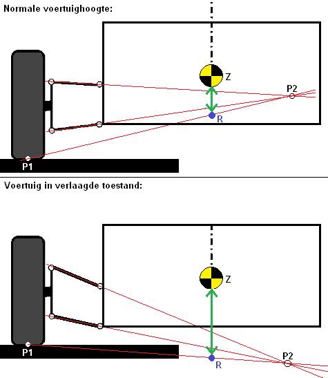 For circuit cars, this is done deliberately. The roll center is then 2 to 3 cm in the road surface. The entire chassis is then adjusted accordingly (springs, shock absorbers, and stabilizers). If this is not done (by only fitting lowering springs), the larger distance (the green arrows) causes the center of gravity (Z) to pivot around the roll axis (R). A force x arm situation arises.