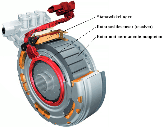 For the operation of the synchronous electric motor, it is essential that the correct coils are controlled by the inverter. To determine which coil (U, V, or W) needs to be energized, the inverter ECU reads the position of the rotor, which is measured by the rotor position sensor, also known as the “resolver.”