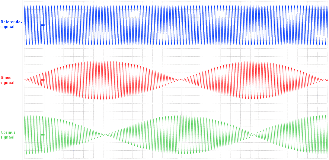 The image below shows the theoretical signals. In reality, the frequency is much higher, making the variation in the amplitude of the sine and cosine signals clearly visible.