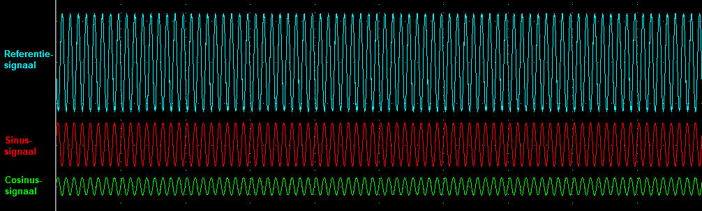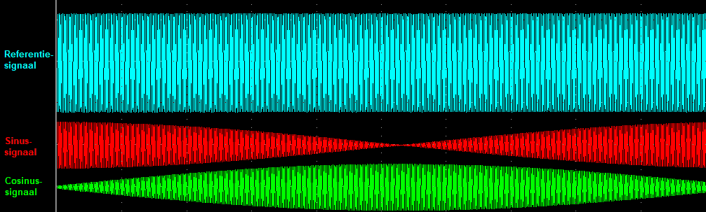 The image below shows the theoretical signals. In reality, the frequency is much higher, making the variation in the amplitude of the sine and cosine signals clearly visible.