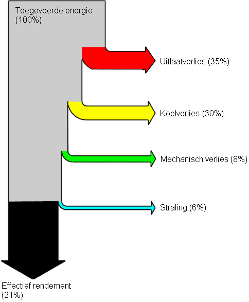 This diagram represents a gasoline engine. A gasoline engine has a relatively low efficiency of around 21%. This means that only 21% of a liter of fuel is used to “drive.” A diesel engine has a higher efficiency (up to 35%). For instance, cooling and radiation losses are less, but mechanical loss is somewhat higher. Therefore, a diesel engine has a different Sankey diagram than a gasoline engine.
