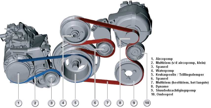 The serpentine belt is often confused with the timing belt. This belt is, of course, entirely different. The serpentine belt is always situated at the very front or the side of the engine block. This belt provides the drive for the alternator and, in modern cars, also for the power steering pump and air conditioning compressor. The crankshaft provides the driving power. The belt drives other components, such as the alternator. There are various ribs (usually 6 or 8) on the belt and on the pulleys (these are the wheels on the components, such as the crankshaft pulley, air conditioning compressor pulley, etc.) so that the belt cannot slip off these pulleys.