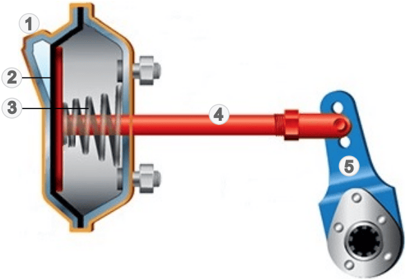 In the next image we see a cross-section of a diaphragm cylinder. The compressed air from the foot brake valve or relay valve enters at number 1 into the chamber to the left of diaphragm (2). The air pressure pushes the diaphragm to the right against the spring force of spring (3). The push rod follows this movement and tilts lever (5) around its pivot. At that moment braking occurs.