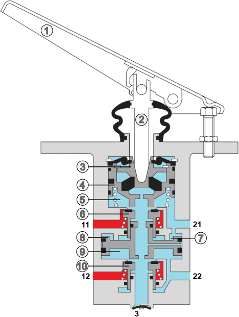 The image below shows the components in the foot brake valve. The explanation follows underneath.